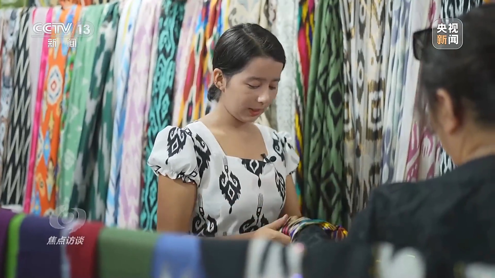 艾德莱斯是维吾尔族传统面料,正在介绍艾德莱斯的塞丽麦是这家店的学徒,也是这里的金牌销售。